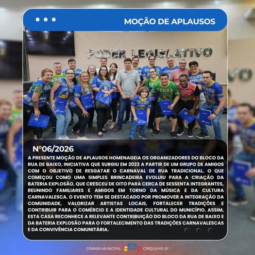 - Moções de Aplausos Nº 6 e 7/2026: Homenagens prestadas aos organizadores do "Bloco da Rua de Baixo" e ao Dr. Joseph Raffoul Júnior, este último pelo compromisso com a saúde pública através da realização de mutirões no município.
