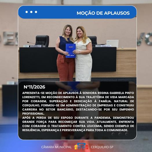 Encerrando a noite com homenagens e reconhecimento, estiveram presentes para receber a Moção de Aplausos a senhora Lívia Giseli Bastos Barreto, conhecida por seu trabalho como Lash Designer, e a senhora Regina Gabriela Pinto Lorenzetti, homenageada em reconhecimento à sua história de vida marcada pela coragem, superação e força diante das adversidades.